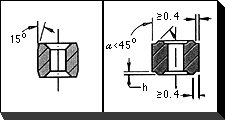 Specification of chamfers with angles over than 45° should be avoided. Instead a small flat area should be designed eliminating the feather edge on the punch which will give it longer life. When the chamfers serve to contain the pressing burr on “h” depth of 0.2mm is sufficient.